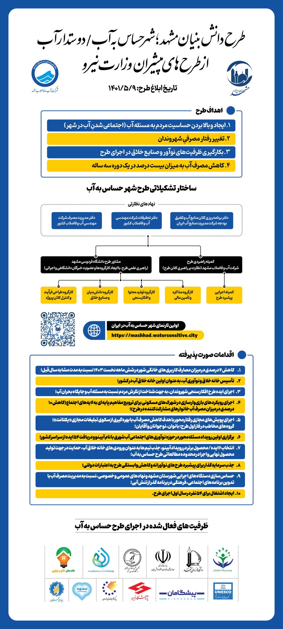 هدف اصلی اجرای این پروژه در شهر مشهد، کاهش ۲۰درصدی مقدار مصرف آب میباشد. تا کنون شرکت آب و فاضلاب مشهد توانسته است تا ارتباطات بسیار مناسبی مابین بدنه حاکمیتی و علمی شهر مشهد برقرار نماید و به ایجاد فهم عمیق مشترک میان ابعاد علمی، اجتماعی، اخلاقی و مهندسی (فنی) کمک نماید.