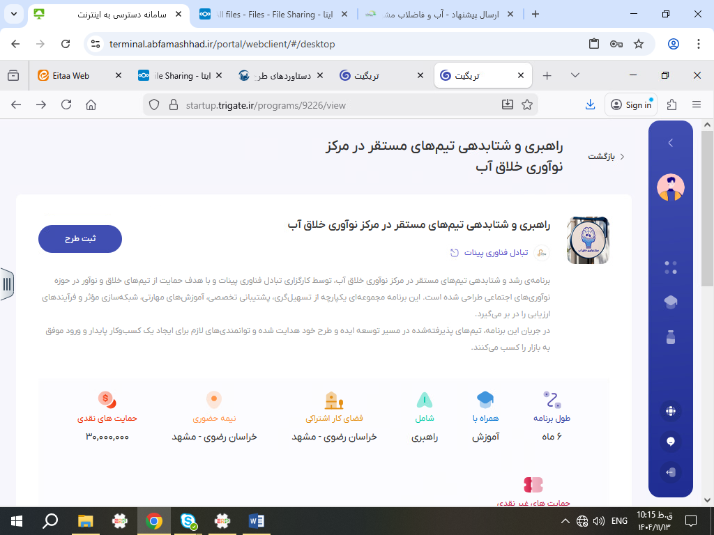سامانه مدیریت پروژه به نشانی «startup.trigate.ir» و با پیگیری کارگزار مرکز نوآوری خلاق آب مشهد راهاندازی شده است. این سامانه علاوه بر ثبت گزارشهای روزانه، دسترسی گروهها به آموزشهای تخصصی حوزه توسعه محصول در نوآوری اجتماعی آب شهری را فراهم میکند.